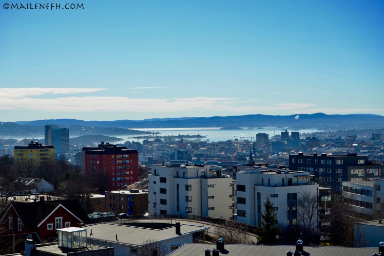 I tillegg viser jo Oslo seg fram frå si beste side for tida, noko som gjer det endå vanskelegare å forstå at eg skal reise herfrå snart. Eigentleg hadde eg planar om å gå meg ein lang tur i dag og ta bilete som eg kan sitje å sjå på når eg saknar Oslo. Dessverre vart eg sett ut av noko som enten er allergi eller forkjølelse. Men eg har mange andre fine bilete frå Oslo, som til dømes desse to av utsikten frå takterassen der eg bur. Begge bileta er tatt 26. mars då det var sol og tjue grader. Nesten slik som i dag.